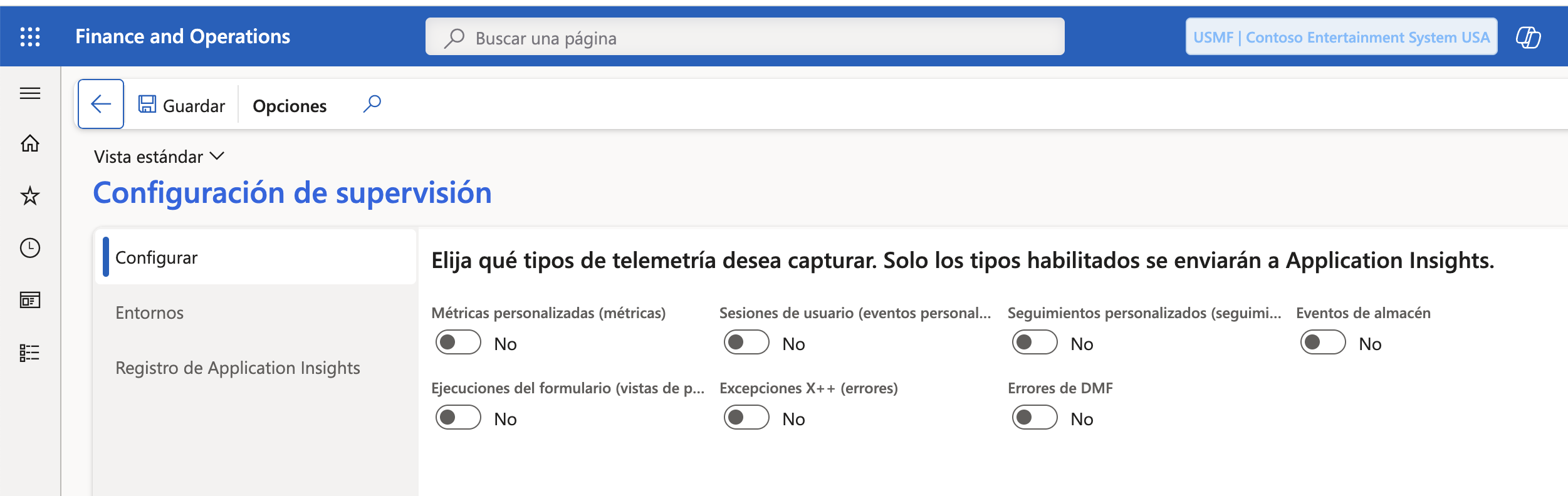 - Activa los tipos de telemetría que quieres enviar a Application Insights.